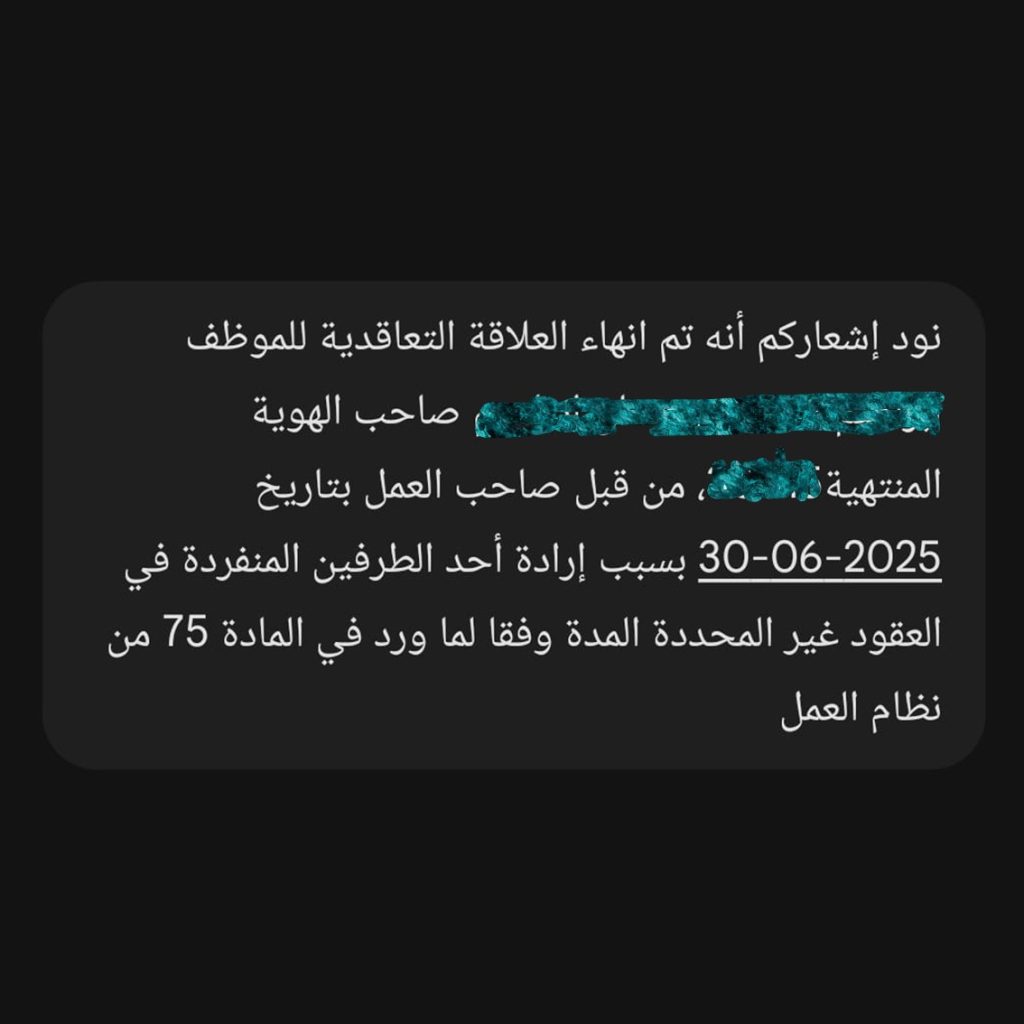عزيزي الموظف، نفيدك بعدم رغبتنا في تجديد عقدك، ونرجو منك مراجعة قسم الموارد البشرية للمخالصة وإنهاء الخدمات